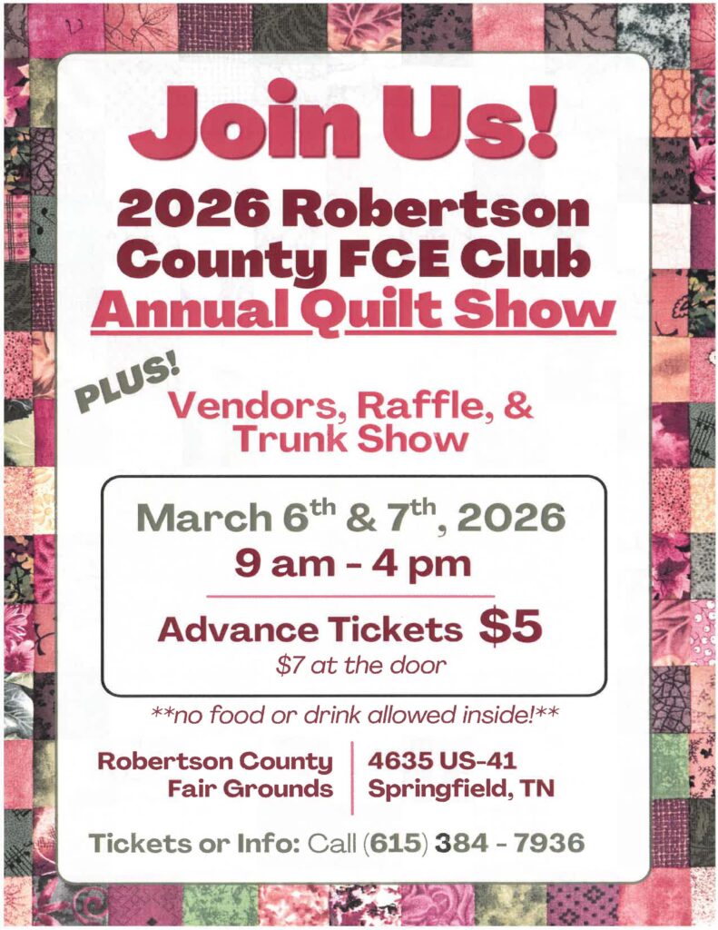 Save the date for the Robertson County FCE Quilt Show on March 6-7, 2026. Quilt entry forms and ticket information will be posted when available!